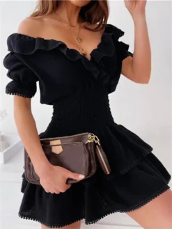 Women’s Warp V Neck Dress, Short Puff Sleeve Solid Color Shirred High Waist Ruffle Mini Dress